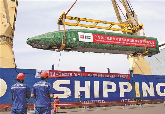 雅万高铁高速动车组在山东港口青岛港装船(8月18日摄)。8月21日,我国出口印尼用于雅万高铁的1组高速动车组和1组综合检测列车在山东港口青岛港完成装船,通过海运发往印尼。新华社发(姜超 摄)
