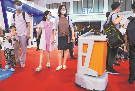 2022世界机器人大会于8月18日至21日在北京召开,2022世界机器人博览会也同期举行。博览会现场的服务机器人吸引了不少参观者的目光。