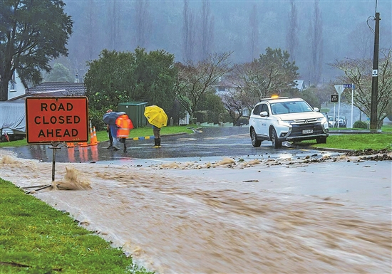8月19日,在新西兰南岛纳尔逊,一处道路因洪水关闭。纳尔逊地区近日遭遇强降雨,引发洪涝和滑坡,400多户居民被迫撤离。新华社发(纳尔逊市政厅供图)