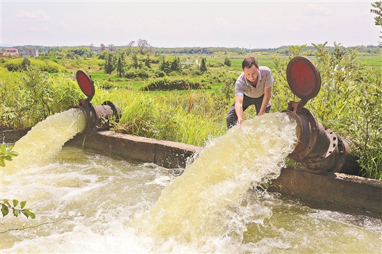 8月23日,在江西省抚州市金溪县琉璃乡澳塘村电力排灌站,当地党员干部察看电力排灌设施运行状况,保障周边稻田灌溉用水。