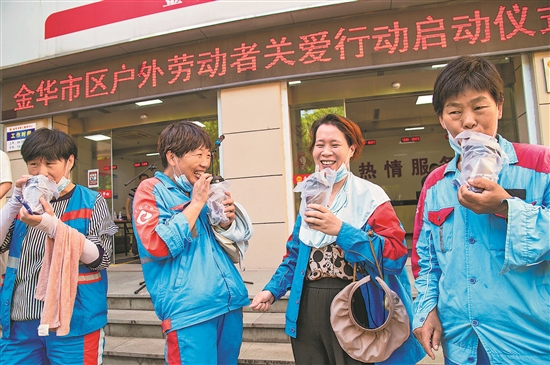 8月23日下午,浙江省金华市职工服务中心门口,工作人员给环卫工人、行政执法人员等户外劳动者送上清凉饮品。
