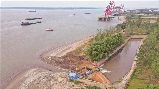 8月23日,在安徽省芜湖市繁昌区新港镇,工作人员用水泵从长江抽水,为农业生产提供灌溉水源(无人机照片)。受长江流域高温少雨影响,安徽省芜湖市繁昌区部分地区近日出现旱情。面对旱情,当地采用拦河筑坝、蓄水、引水、提水等方式,将长江水引入农田进行灌溉,最大限度减少旱情对农业生产的影响。新华社记者 周牧 摄