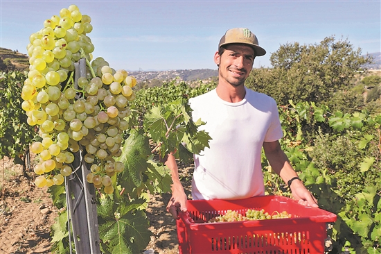 8月23日,工作人员在法国尼斯一家酒庄的葡萄园收割葡萄。