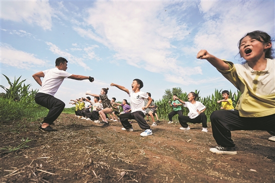 刘龙(左一)带着孩子们练习传统武术(8月16日摄)。