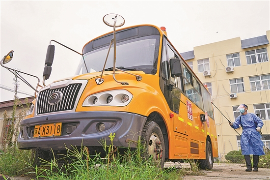 8月27日,工作人员在南京市高淳区固城中学对校车进行消杀。