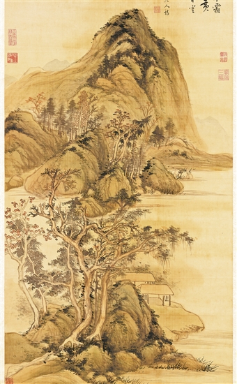 董其昌擅于山水画,师法于董源、巨然、黄公望、倪瓒,笔致清秀中和,恬静疏旷,用墨明洁隽朗,温敦淡荡。其青绿设色古朴典雅,为“华亭画派”杰出代表,兼有“颜骨赵姿”之美。