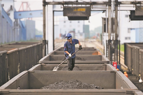 8月25日,在江西省煤炭储备中心的长江码头,工人们正在货物列车上平整电煤。8月以来,江西各地持续高温,用电量持续攀升。南铁九江车务段和水运部门积极开展水铁联运,日夜兼程抢运电煤,保证电厂用煤需要。胡国林 代建力 摄