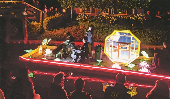 游行开始,两艘“南京船”在成人组“贡多拉”船队中领航出发,船上搭载着中国非物质文化遗产秦淮灯彩,中荷艺术家在船上联袂进行民歌器乐表演,满满的中国元素带给观众惊喜,赢得热烈掌声和欢呼声。