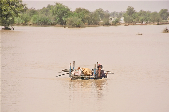 8月27日,在巴基斯坦拉金布尔,一名女子带着个人物品涉水前行。新华社发(曼苏尔 摄)