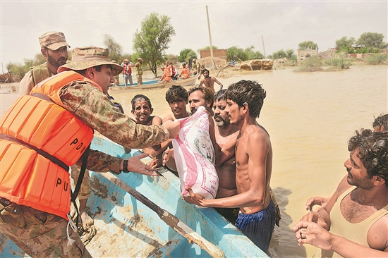 8月27日,在巴基斯坦拉金布尔,巴基斯坦军人向受灾民众发放物资。新华社发(曼苏尔 摄)