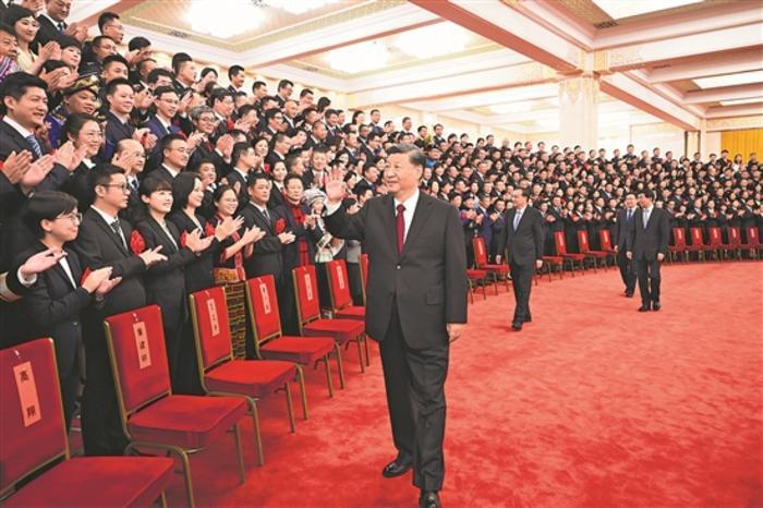 上午11时,习近平等来到人民大会堂北大厅,全场响起热烈掌声。习近平等走到代表们中间,同大家亲切交流并合影留念。