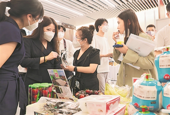 8月30日,对接会嘉宾在参展企业展位前品尝水果。