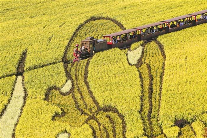 9月1日,游客在“稻梦空间”景区乘坐“小火车”游玩。