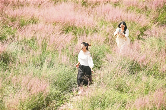 秋日时节,该花海内的粉黛乱子草进入最佳观赏期,“粉色浪漫”醉游人,连片的粉紫色花穗随风摇曳,如梦如幻,吸引众多游客前来观赏游玩。刘朝富 摄/视觉中国