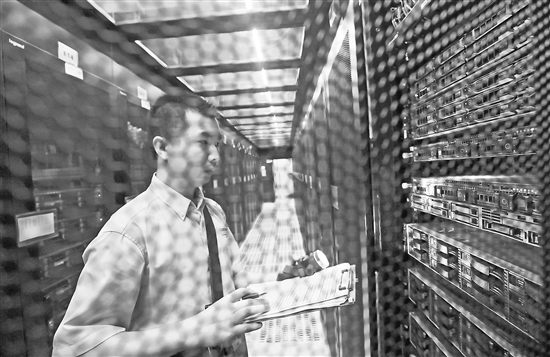 据了解,该园采用全天候自然水冷,集数据存储应用、服务外包和芯片高端智能制造等大数据产业链于一体,是目前全国最节能绿色生态数据中心之一。自2017年建园以来,已签约落户5个数据中心共2.48万个机架,入驻企业60余家。图为8月29日工作人员在湖南省资兴市东江湖大数据中心机房进行设备运行巡查。