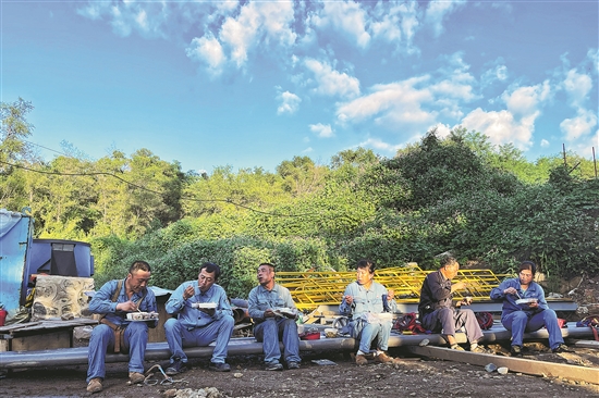 图为8月23日中午,土建四队队员们席地而坐吃盒饭。赵钰 钱丹 摄
