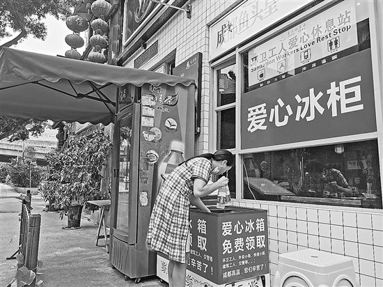赵春燕说的爱心冰柜平时也放在店门口。今年入夏后,感到天气异常炎热,赵春燕和黄明腾出了店里的一个冰柜装满矿泉水,免费提供给环卫工人、交警、外卖小哥等户外劳动者和有需要的人群。为了显眼,他们在冰柜外贴上了红纸,上面用白字印着“爱心冰柜”“免费领取”等字样。