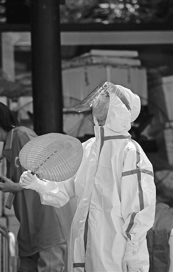 8月3日,成都一名身穿防护服的核酸检测人员用扇子降温。王效 摄/人民视觉
