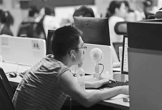 因为空调停运,成都一名上班族自备了小风扇降温。视觉中国 供图