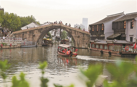 9月11日,游客在大运河江苏无锡段的清名桥历史文化街区游玩。中秋小长假期间,人们用多种方式休闲放松,乐享假期。新华社发 (还月亮 摄)