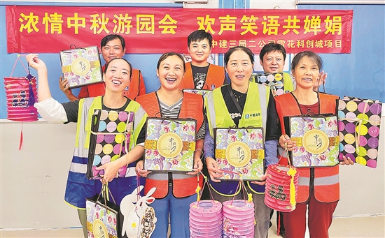 9月8日,中建三局二公司华南公司深圳雪花科创城项目组织近50名工友开展“浓情中秋游园会 欢声笑语共婵娟”趣味游园活动。图为项目职工与工友共同制作手工花灯、猜灯谜。本报记者 刘友婷 本报通讯员 邢芳菲 摄