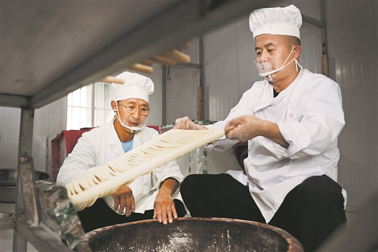 8月16日,父亲李长满(左)在向儿子李念平口手相传空心挂面的“缠筷子”工序。