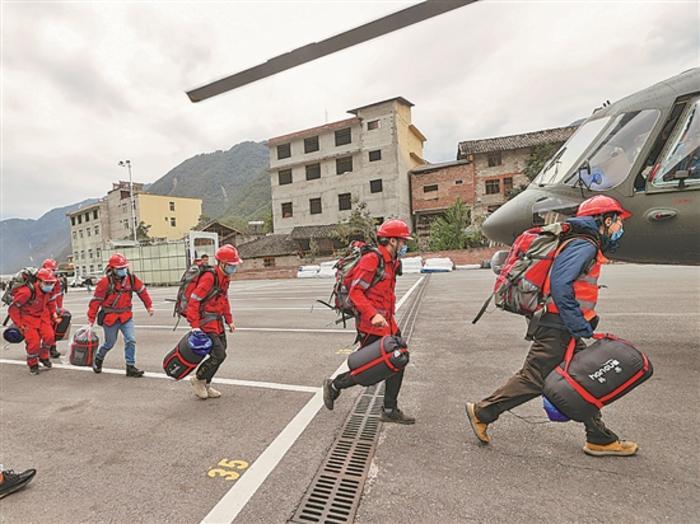 9月7日,在四川省甘孜州泸定县磨西镇,四川省冶勘设计集团有限公司的6名调查队员携带装备搭乘直升机前往海螺沟景区开展地质灾害应急排查工作。