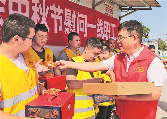 近日,中国铁建电气化局三公司工会干部与志愿者一起,带着月饼、苹果、食用油、大米等慰问品来到京滨城际铁路智能预配中心,慰问中秋节期间坚守岗位的1000多名一线职工。本报通讯员 郑传海 李强 摄