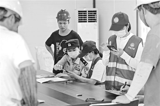 9月13日,安徽省舒城县公安局城东派出所民警联合社区志愿者深入辖区建筑工地,指导务工人员下载“国家反诈中心”APP,讲解电信网络诈骗犯罪的种类、作案手法、识破技巧等内容。本报通讯员 王可海 摄