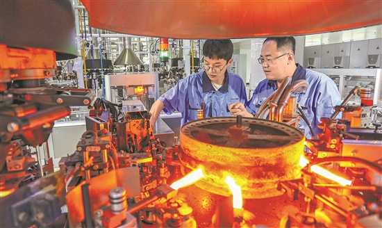 9月15日,威高集团预灌封生产车间主任兰明昌(右)指导“订单班”学员王常发检验生产设备。