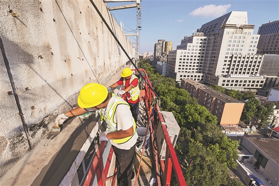 9月14日,北京市东城区北二环外的一处办公楼外,防水工正在楼体外立面做防水。据了解,随着城市建筑的不断老化,我国每年都有大量的房屋需要进行防水施工,而防水工就是对建筑表层进行防水施工与维护管理等技术工作的工人。与家庭装修中防水施工不同,建筑物的防水需要保证建筑结构不受雨水、湿气和地下水的渗漏和侵蚀,充分发挥建筑的功能,保证建筑的使用寿命。