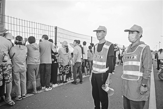 连日来,为保障观潮市民和游客的安全,浙江省杭州市萧山区新街街道的防潮队员高哨峰、傅帮华、贾文军忙着在江堤上巡逻。他们要看护一段1.9公里长的钱塘江岸,每天负责劝导观潮人远离危险地段、劝返下江堤垂钓的钓鱼人、检查江岸边的防护设施,被称为“喊潮人”。目前钱塘江两岸共有“喊潮人”372名。