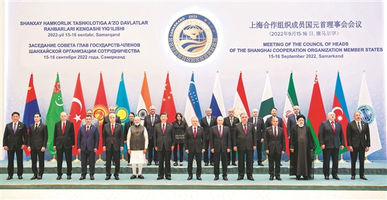当地时间9月16日,国家主席习近平在撒马尔罕国际会议中心出席上海合作组织成员国元首理事会第二十二次会议并发表重要讲话。这是大范围会谈前,与会各方集体合影。新华社记者 李涛 摄