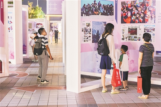 9月15日,北京王府井步行街,市民正在观看“2008-2022双奥之城 双奥会刊”主题展,通过长约百米的“卷轴”式参观路线,感受千年古都遇上现代奥运的火花。本报记者 王伟伟 摄