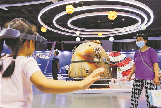 9月15日,一名小朋友在北京科学中心“光年深处”展厅通过VR眼镜感受载人航天。当日,神舟十三号载人飞船返回舱首次面向公众展出,返回舱降落伞、长征三号甲运载火箭残骸等一批珍贵的航天器实物也同时亮相。
