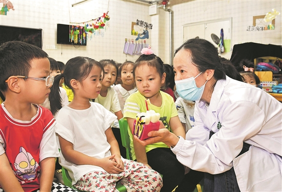 9月15日,安徽合肥,常青街道淝南社区在辖区幼儿园开展“爱护牙齿,健康成长”卫生科普教育活动,牙科医生现场为儿童讲解正确的刷牙方式和爱牙护牙的知识。韩苏原 摄/视觉中国