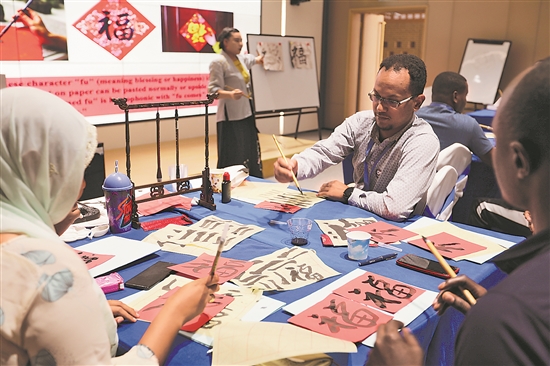 9月18日,在吉布提非洲青年创新创业中心,吉布提孔子学院老师为来自吉布提、埃塞俄比亚、肯尼亚、乌干达的非洲创业青年上了一堂生动的中国文化课。风俗、书法、剪纸等中国文化引起了学员们的浓厚兴趣。