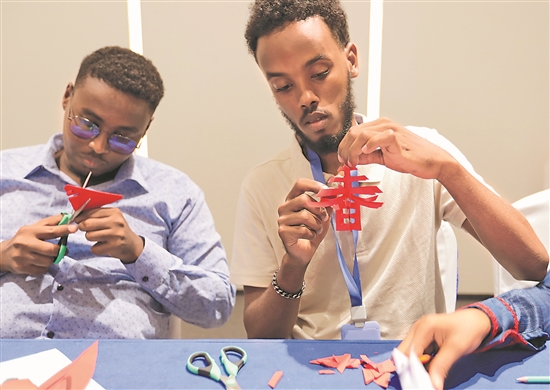 9月18日,在吉布提首都吉布提市,学员们学习剪纸。新华社记者 董江辉 摄