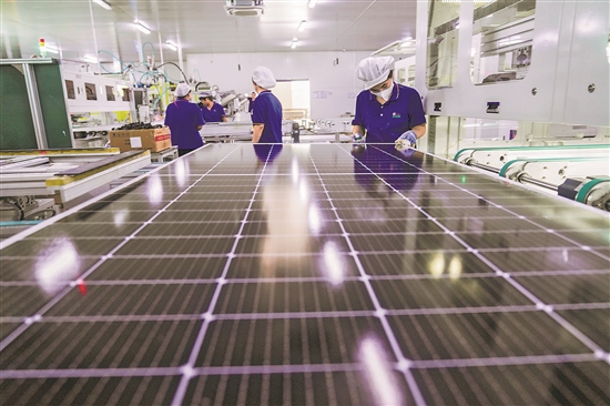 9月17日,山东省东营经济技术开发区一企业内,工人在生产太阳能电池板。