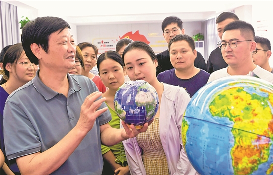 9月19日,大国工匠、全国劳动模范、全国道德模范朱恒银(左一)在安徽省六安市金安区望城街道安丰社区向居民介绍地壳结构等知识。朱恒银是313地质队的高级工程师,他以自己从钻探工人到大国工匠的经历倡议群众从身边的小事做起,爱护环境。陈力 摄/人民图片