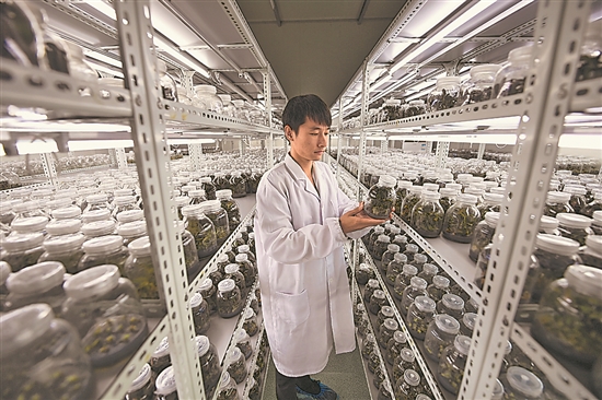 9月21日,在杭州市临安区昌化镇中草药种植基地,技术骨干郭二彪在育苗室内查看金线莲的育苗情况。