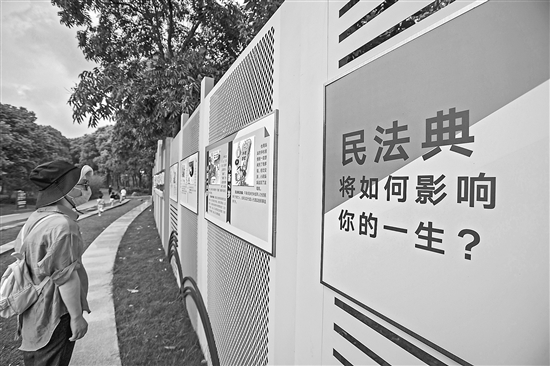 9月17日,上海,首届上海法治文化节系列主题活动——1号湾民法典主题公园体验活动在宝山区举行,市民在民法典宣传专栏阅读。当日,首届上海法治文化节系列主题活动在宝山区举行,探索打造“公园+法治”的立体化、数字化、开放式普法新阵地。视觉中国 供图