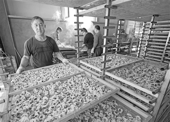 9月20日,石家庄市井陉矿区贾庄镇中药材加工企业工人将太行白菊装盘烘干。