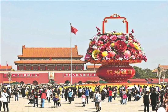 9月25日,北京,“祝福祖国”主题花坛亮相天安门广场,喜庆的氛围吸引了不少市民到此游览。