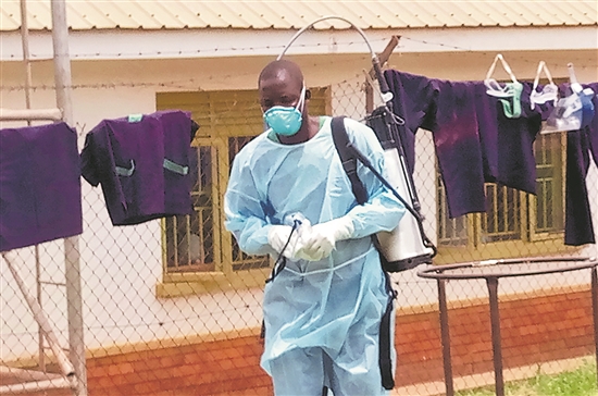 图为在乌干达穆本德区,医务人员走在埃博拉治疗中心内。