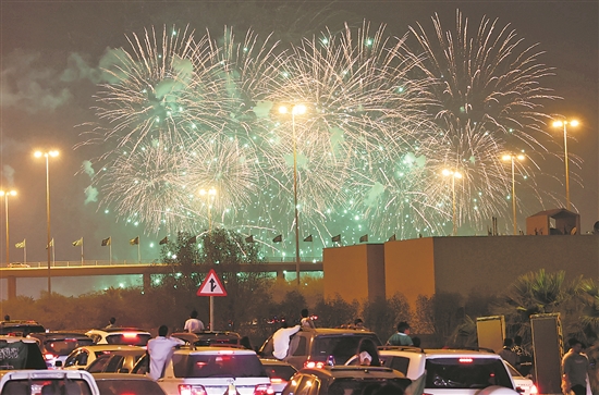 当日,沙特多地燃放烟花,庆祝国庆日。新华社记者 王海洲 摄