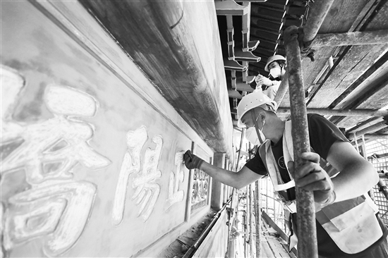 9月15日上午,北京前门大街五牌楼,北京城建亚泰建设集团有限公司油工季得刚师傅正在给“正阳桥”牌匾进行精细打磨。近年来,该公司先后承揽了故宫博物院、颐和园等古建修缮及仿古建设项目,还建立了古建专业知识理论培训中心和实操培训基地,培育了一大批年轻化、专业化的古建修缮技艺传承人。