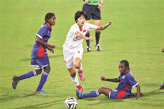 南京青奥会足球女子小组赛中的涂琳俪(右)。视觉中国 供图
