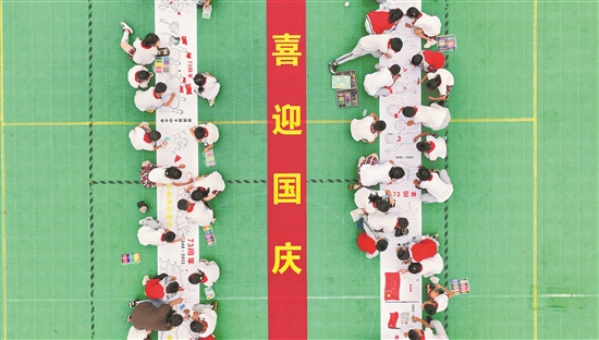 9月28日,浙江省湖州市德清县钟管镇干山小学,孩子们正在绘画。当日,干山小学开展“百米画卷迎国庆”活动,孩子们用手中的画笔绘出五星红旗、天安门等,表达对祖国的热爱和祝福之情,庆祝中华人民共和国成立73周年。