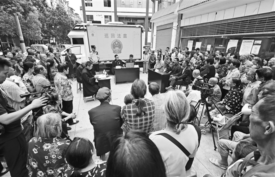 9月14日,重庆市云阳县人民法院南溪人民法庭运用“车载便民法庭”,在南溪镇水市社区面向居民群众院坝开庭,公开审理八旬老人蒲某某诉四个子女赡养纠纷一案,百余名居民参加旁听。通过案件审理和现场普法,提高公民法治意识,弘扬中华传统美德。饶国君 摄/人民图片